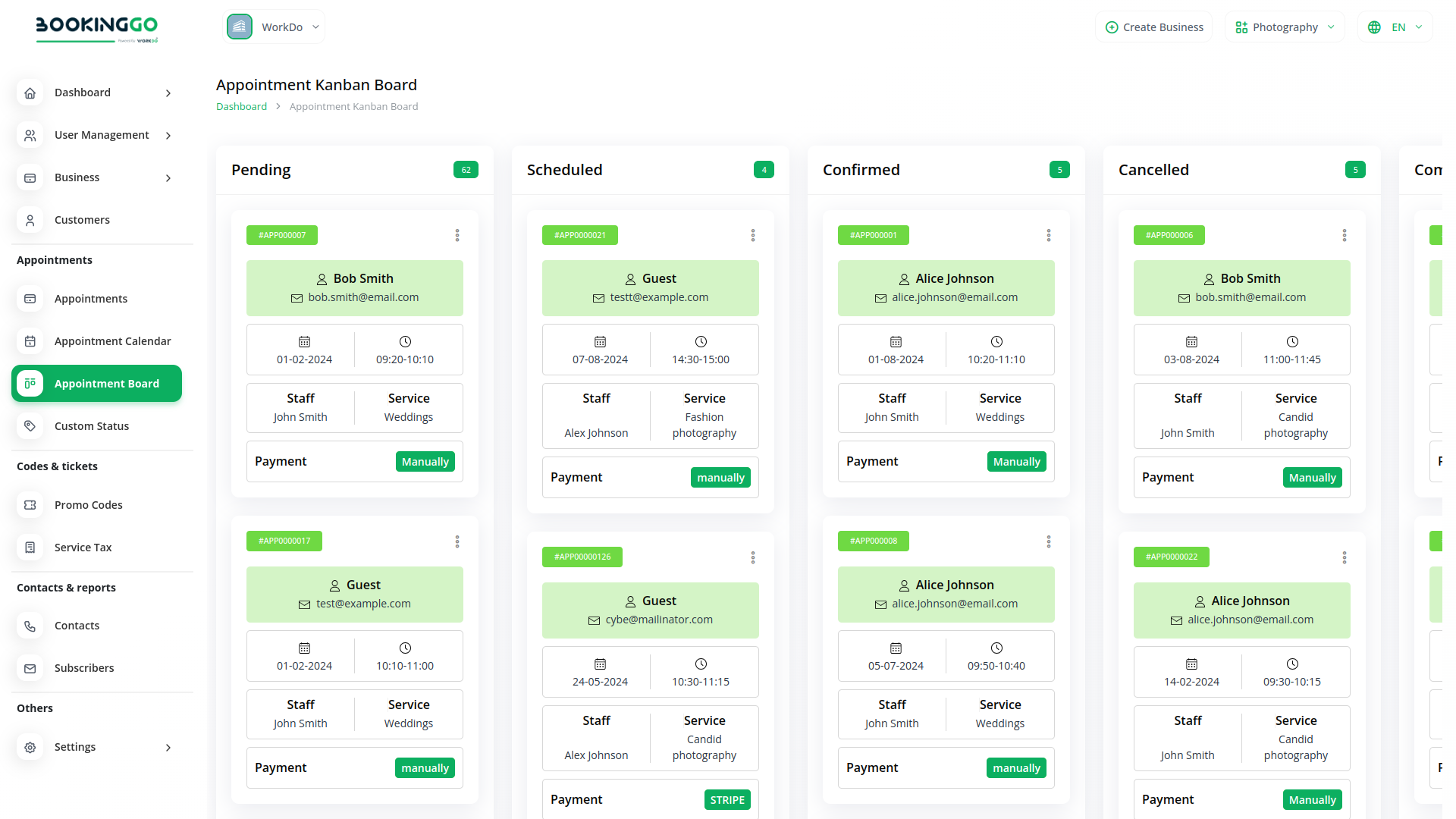 The Appointment Kanban Board displayed in BookingGo provides a clear and intuitive visual workflow for managing appointments. Each custom status, such as "Pending," "Confirm," "In Progress," and "Done," is represented as a separate column. These columns allow users to see the progress of each appointment at a glance, ensuring a smooth and organized scheduling process. Appointments are displayed as detailed cards, including key information like client name, email, service, staff, payment method, and date, making it easier to manage and track tasks efficiently. As users move cards between columns, the appointment status is automatically updated in real-time within the system.